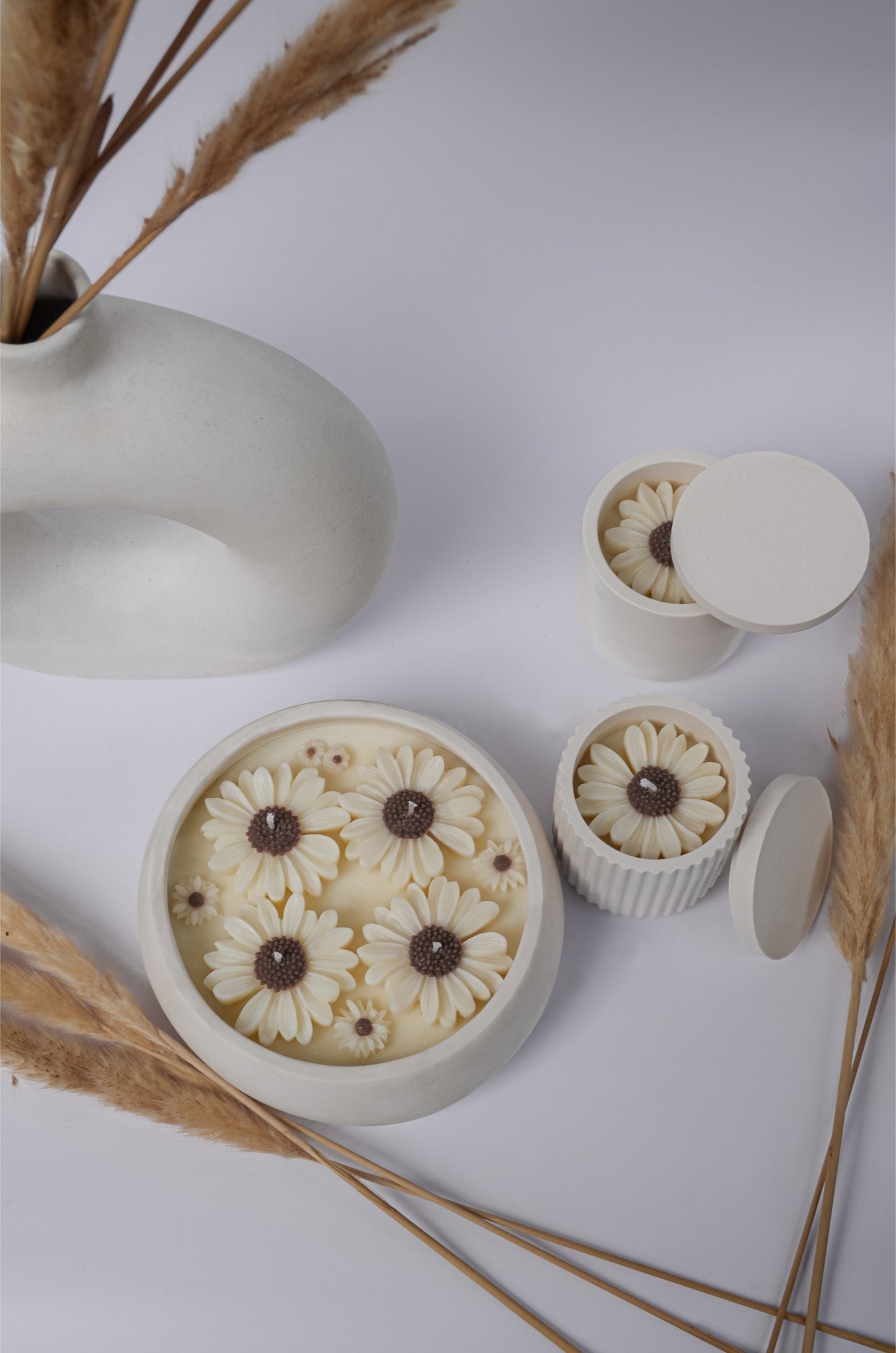 Enhance your home décor with the timeless elegance of our candles, embracing the traditional Japanese aesthetic. Our cotton wick candles are handmade into unique neutral vessels & topped with daisy flowers. From the jar to the filling, each candle is entirely handmade in our studio and will take you on an olfactory journey for the ultimate moment of relaxation.